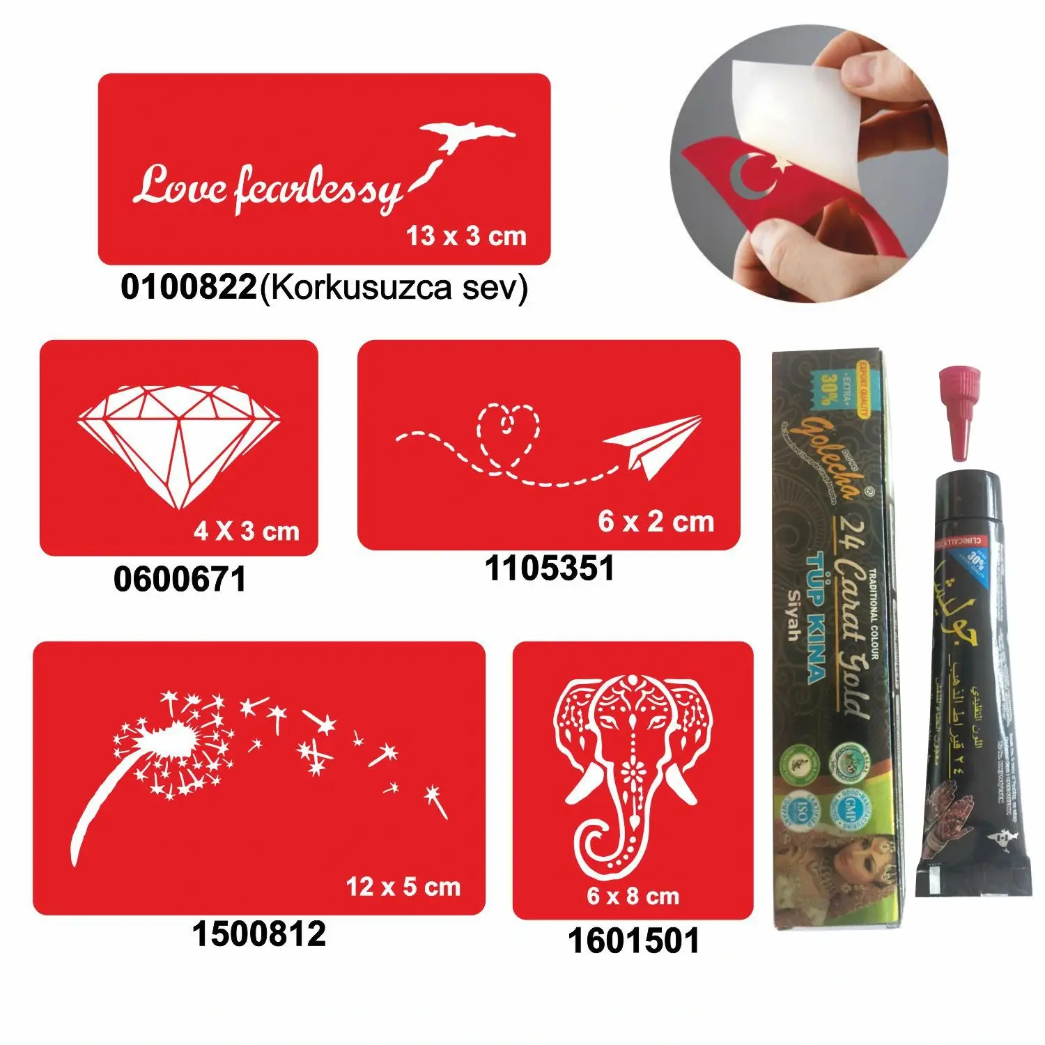 Siparişinizle birlikte  Resimde gösterilen Dövme Şablonları ve 1 Tüp Kına Gönderilir.